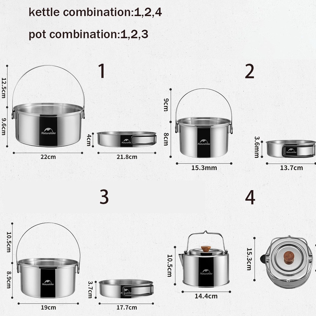 Naturehike 3 in 1 Cookware Set Cooking Set Pot Set Kettle Pan Pot Camping Outdoor Picnic Stainless Steel NH22CJ005