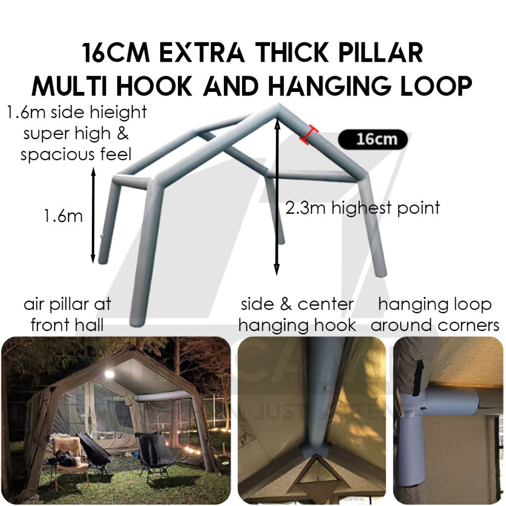 Introducing the MARS08 Air Tent, an air tent masterpiece designed for adventurers who value comfort and versatility. With its two interconnected modules, offering a spacious 16m² area (8+8m²), this tent redefines outdoor living. The 1-room 1- living hall system ensures privacy and functionality, making it perfect for families or groups.